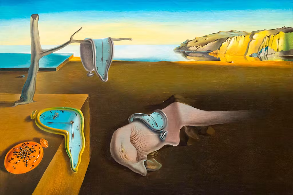 “The Persistence of Memory" is a famous surrealist painting by Salvador Dalí, completed in 1931. Known for its dreamlike quality, the artwork features a landscape with melting pocket watches draped over various objects, including a tree branch, a ledge, and a mysterious amorphous figure.